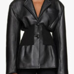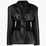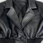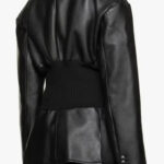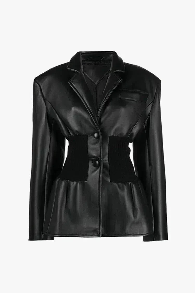 Maak een gedurfde indruk met de Bettina jas met ribgebreide panelen. Gemaakt van glad vegan materiaal en ribbreisel, combineert deze opvallende patchwork blazer stoere en vrouwelijke elementen. De elastische taille creëert een flatterend zandloperfiguur, terwijl de peplumzoom een speelse twist toevoegt.