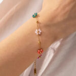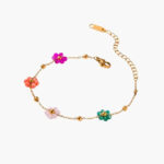 Geef je look een vrolijke, kleurrijke touch met deze charmante bedelarmband. Bloemenkralen zorgen voor een speelse, zomerse uitstraling, terwijl de goudkleurige afwerking een verfijnde, luxueuze feel toevoegt. Draag solo voor een subtiele kleuraccent of combineer met andere armbanden voor een boho, gelaagde look.