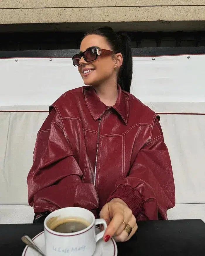 Ontdek de Valentina bomberjas, waar gedurfde stijl en dagelijks comfort samenkomen. Gemaakt van vegan materiaal met een glanzende rode afwerking en contrasterende witte stiksels, is dit een echte blikvanger voor zowel casual momenten als geklede gelegenheden.