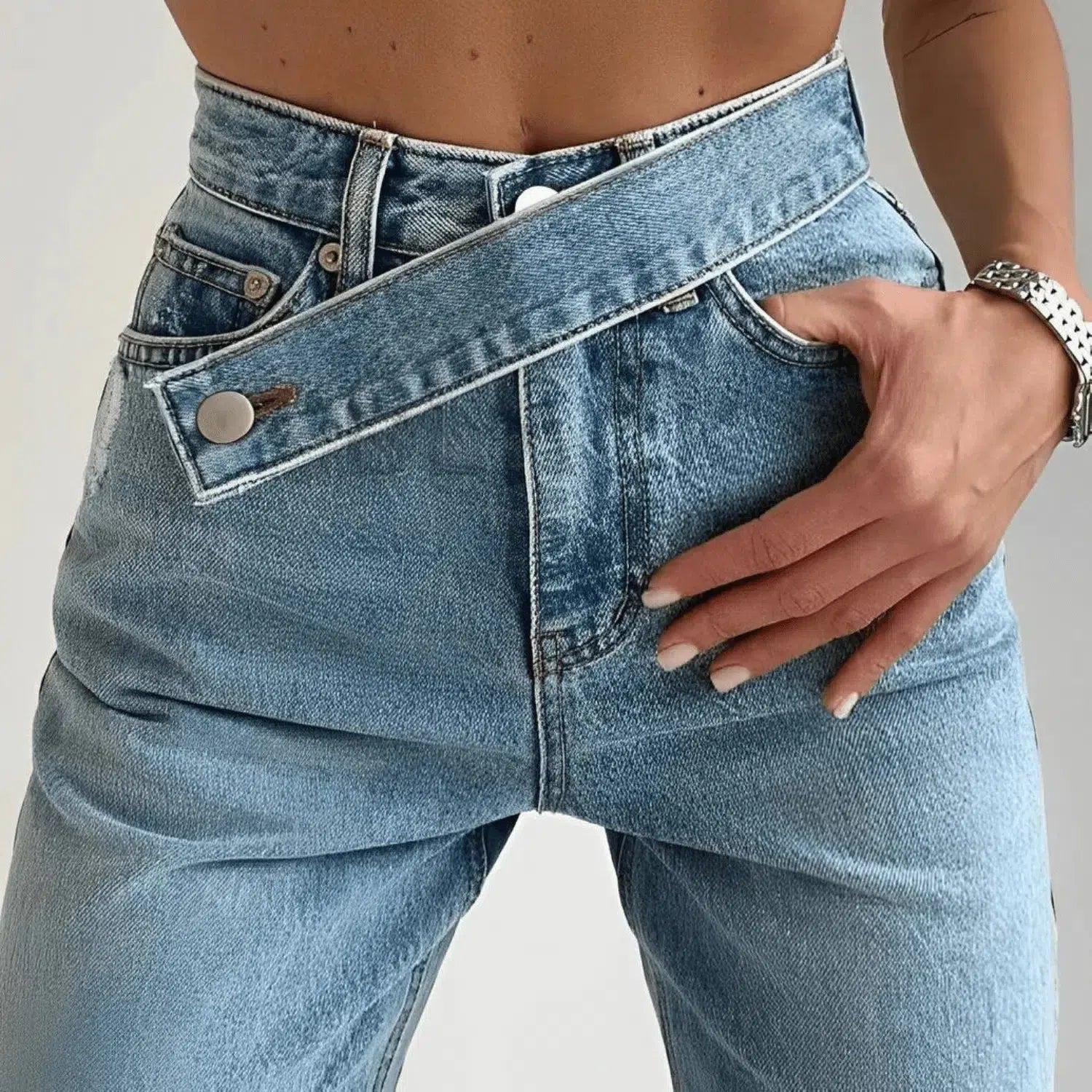 Geef je denimgarderobe een moderne twist met de Casila rechte jeans, ontworpen met een unieke asymmetrische knoop- en ritssluiting. Deze high-waist jeans heeft een rechte pijp voor een tijdloos silhouet en is voorzien van functionele voor- en achterzakken voor dagelijks gemak.