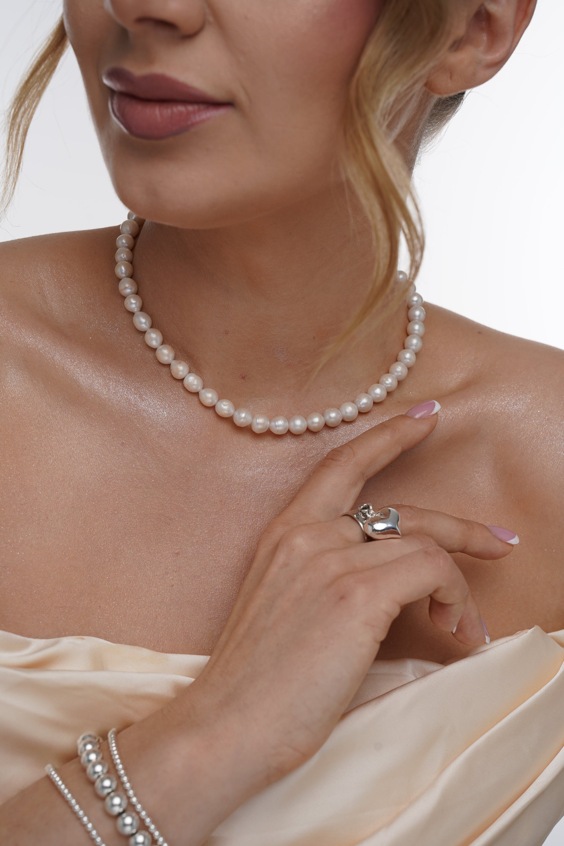 Elegante zoetwaterparelketting van 45 cm, vervaardigd met 8 mm parels en afgewerkt met een zilveren sluiting en verlengketting. Tijdloos en veelzijdig — perfect voor zowel dagelijks gebruik als speciale gelegenheden.