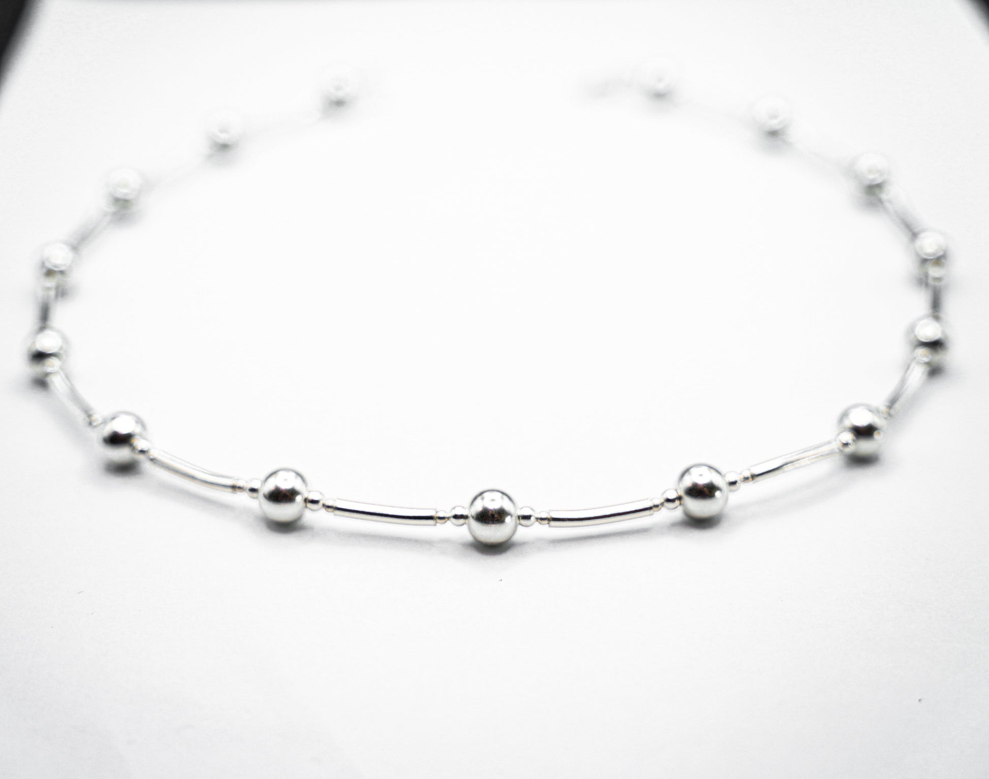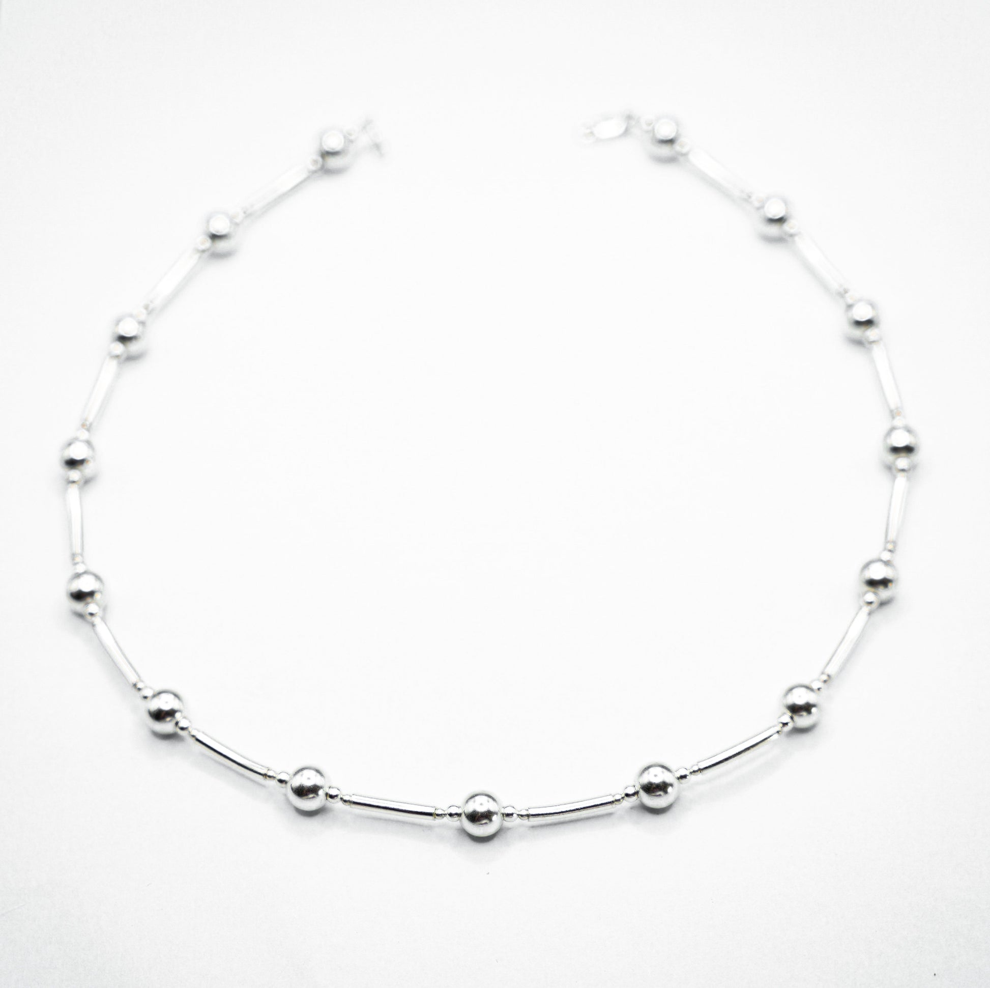 Elegante sterling zilveren ketting met een stijlvol patroon van buisjes en kralen. Deze unieke combinatie van 15 mm buisjes en 8 mm kralen zorgt voor een moderne en tijdloze uitstraling. Perfect te dragen als statement piece of te combineren met andere kettingen.